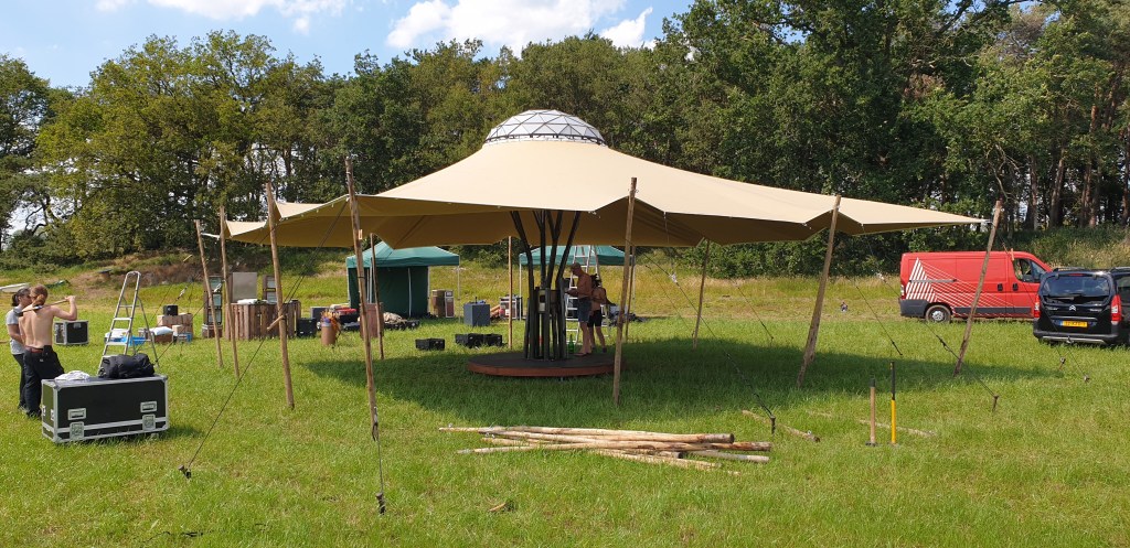 In 2018 I was approached to design a tent for a touring festival bar. The strong connection with nature and the expressed desire for a light installation led me to build a steel tree which serves as a window during the day and as a projection screen during the night.